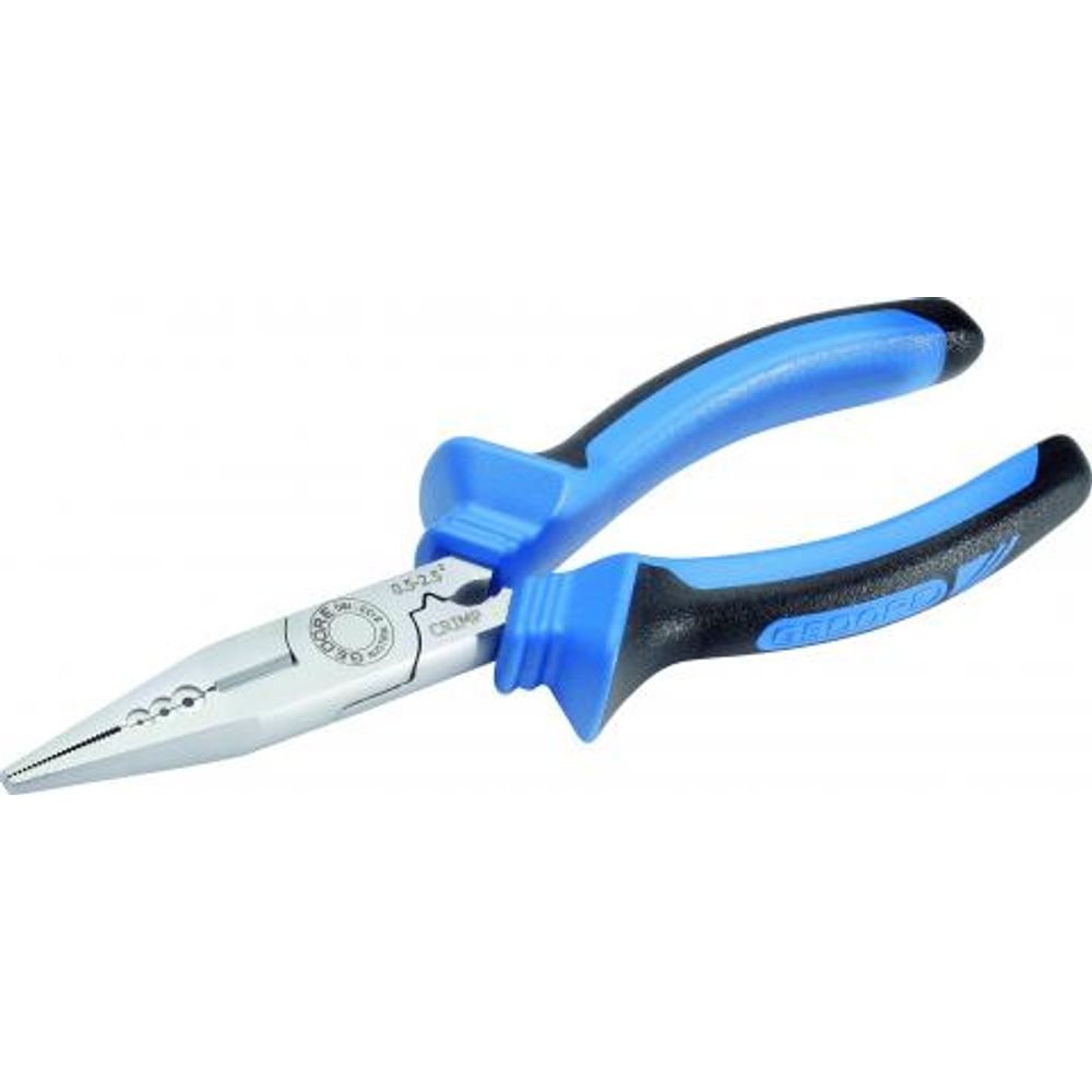 Corpo em aço Gedore-Vanadium e empunhadura em polímero anti-chamas nas cores azul e preto, padrão Gedore. Acabamento niquelado e cromado. Empunhadura ergonômica e antideslizante, com abas protetoras arredondadas para maior conforto e segurança. Produzida por injeção, propiciando isolação até 1000 V, conforme norma NBR 9699, submetida à ensaios de: impacto, tensão elétrica, aderência, inflamabilidade e pressão/penetração. Utilizar este Alicate isolado, em tensão máxima de 1000 V em corrente alternada e 1500 V em corrente contínua, conforme norma NBR 9699. Atende com segurança a norma regulamentadora NR 10 - Segurança em Instalações e Serviços em Eletricidade, possui certificado de isolação. Tratamento térmico total e corte temperado por indução com dureza de 62 - 64 HRC. Alicate com bico semirredono, reto, ponta fina, com dentes finos e em paralelo, que permite puxar, segurrar, cortar, desencapar, amassar e crimpar fios e cabos. Indicado para corte de arame com dureza média, diâmetro máximo de Ø 1,6 mm e com resistência à tração 1600 N/mm². Permite desencapar cabos com seção de 0,5; 1,5 e 2,5 mm² , amassar cabos com seção de 1,0 - 2,5 mm² e crimpar terminais com seção de 0,5 - 2,5 mm². Para utilização em mecânica e eletrônica.